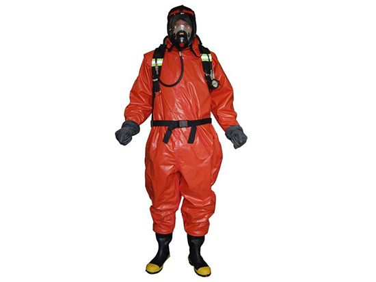 氣密重型防化服,雙面Hypalon?涂層面料(550g/m2),組件和接縫采用內/外部雙硫化密封,帶有高氣密性密封拉鏈,高強度、抗沖擊、高清晰度面屏,頭部后面配置雙排氣閥門。防護時間:防較強滲透性溶劑(甲苯等)、強酸堿(96%硫酸等)或強穿透性毒劑(芥子氣等)的時間≥2小時,防化靴防毒時間≥5小時,抗多種高濃度化學試劑滲透長達8小時以上,卓越的防酸堿性能,防火阻燃,耐UV/臭氧、抗曲饒龜裂、耐磨、防霧、防固體顆粒,浸水2小時以上不滲水,拉伸強度:徑向、緯向≥20KN/m。在-40℃~35℃范圍內可正常使用,保證穿著者的舒適及安全。